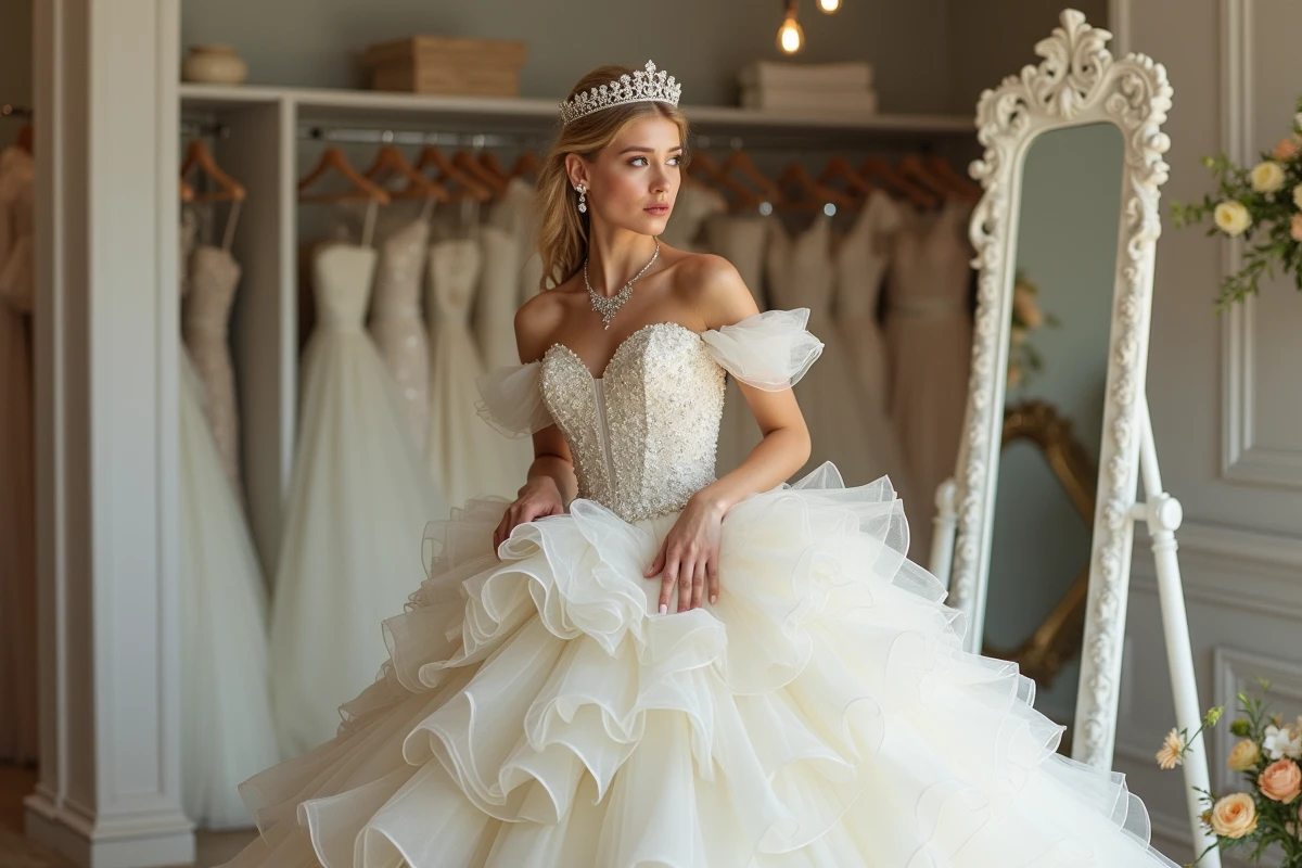 Maîtriser les volumes, c’est tout sauf accessoire. La jupe imposante, signature de la robe princesse, peut vite prendre le dessus si le haut du corps disparaît ou si l’équilibre n’est pas au rendez-vous. Pour les gabarits menues ou les silhouettes fines, mieux vaut délaisser les superpositions de tulle ou les crinolines trop rigides. Privilégiez une structure souple, légère, qui souligne la taille sans écraser l’ensemble. Une créatrice ou une conseillère lors des essayages saura ajuster le corsage, marquer la taille, ou ajouter ce détail subtil qui fait toute la différence.